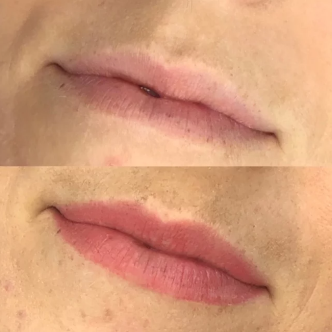 Lip blushing is a cosmetic tattoo that adds a blush of natural color to pale lips. Bringing color to the edge of your lips will give them a plump and youthful look. A lip blush tattoo is different from a traditional lipstick tattoo because it is not as dense. it resembles more of a lip stain, rather than a solid lip stick look.